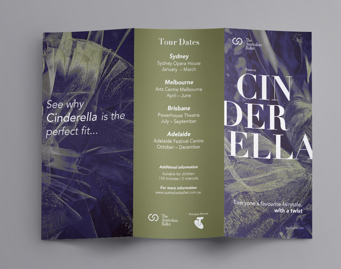 Brief: The Australian Ballet is touring its acclaimed performance of Cinderella. They require a series of supporting promotional and educational pieces to be developed. These items of collateral will be distributed to raise awareness of the performance as it makes its way around the country. As part of the supporting collateral, a DL size promotional brochure is required to be developed in InDesign and produced to a high quality, finished art standard (print ready)